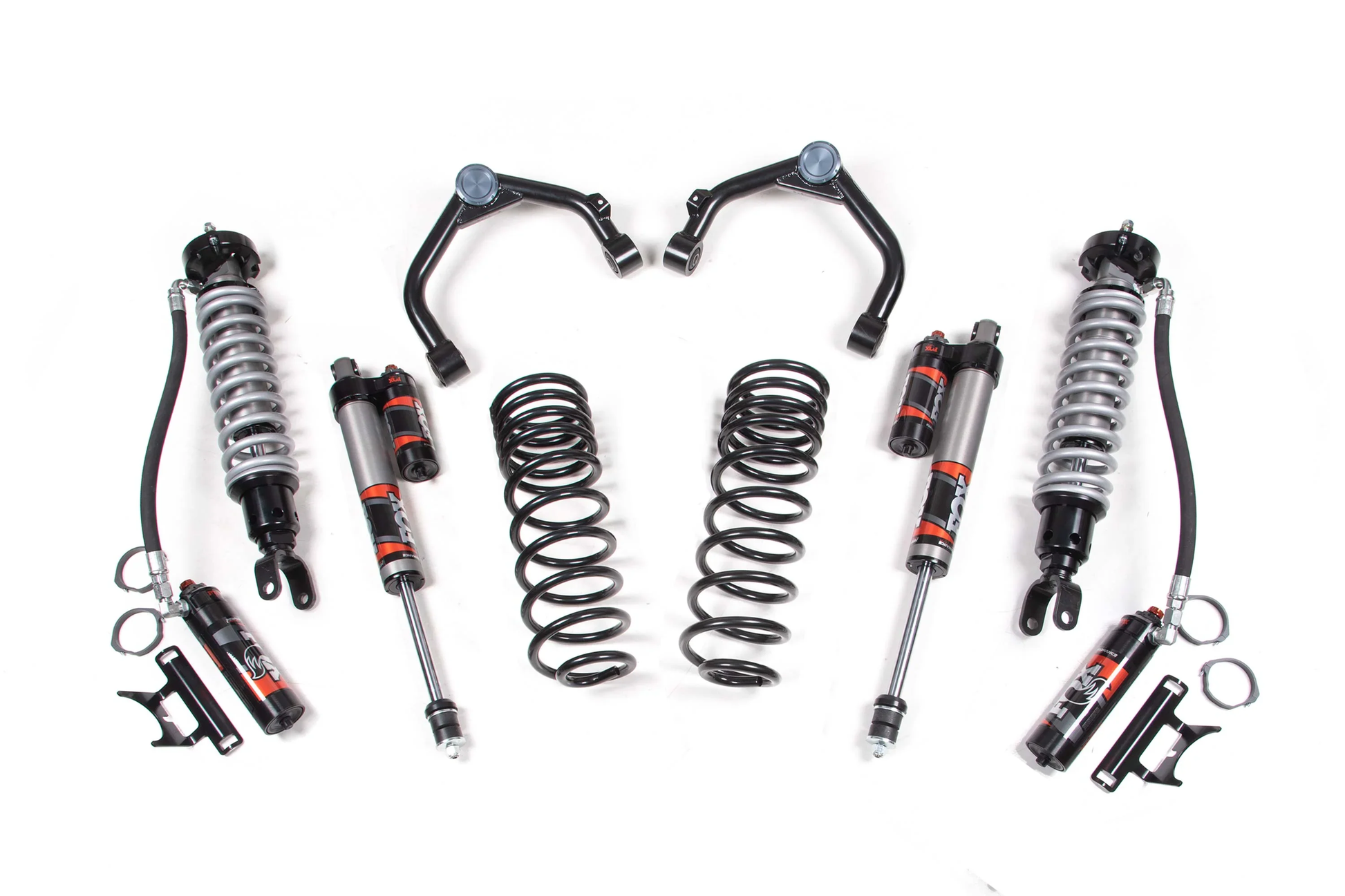 Up front the lift kit includes FOX 2.5 Performance Elite Series remote reservoir coil-over shocks and heavy duty tubular upper control arms for increased strength. In the rear the stance is leveled out with a pair of 1.5" dual rate coil springs designed for exceptional ride quality and additional load capacity over stock. Your choice of rear FOX 2.0 Performance Series IFP gas shocks or upgrade FOX 2.5 Performance Elite Series DSC reservoir shocks are offered to match the front for next level performance and easy tuning to meet the demands out on the trail.