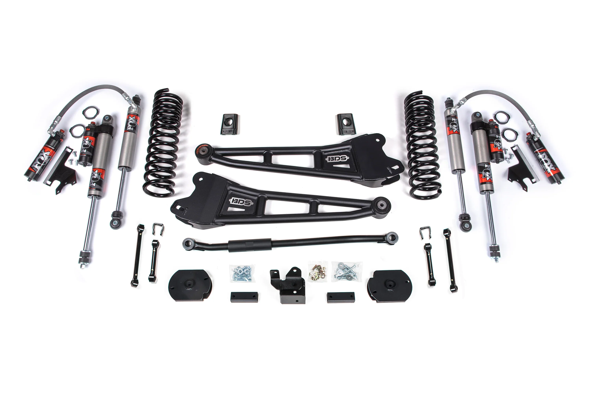Up front the lift kit includes diesel-specific Pro-Ride coil springs, heavy duty replacement radius arms, high strength 1-3/8 inch solid steel track bar for steering correction, sway bar links, brake line brackets and precision tuned NX2 or FOX 2.0 nitrogen charged shocks.