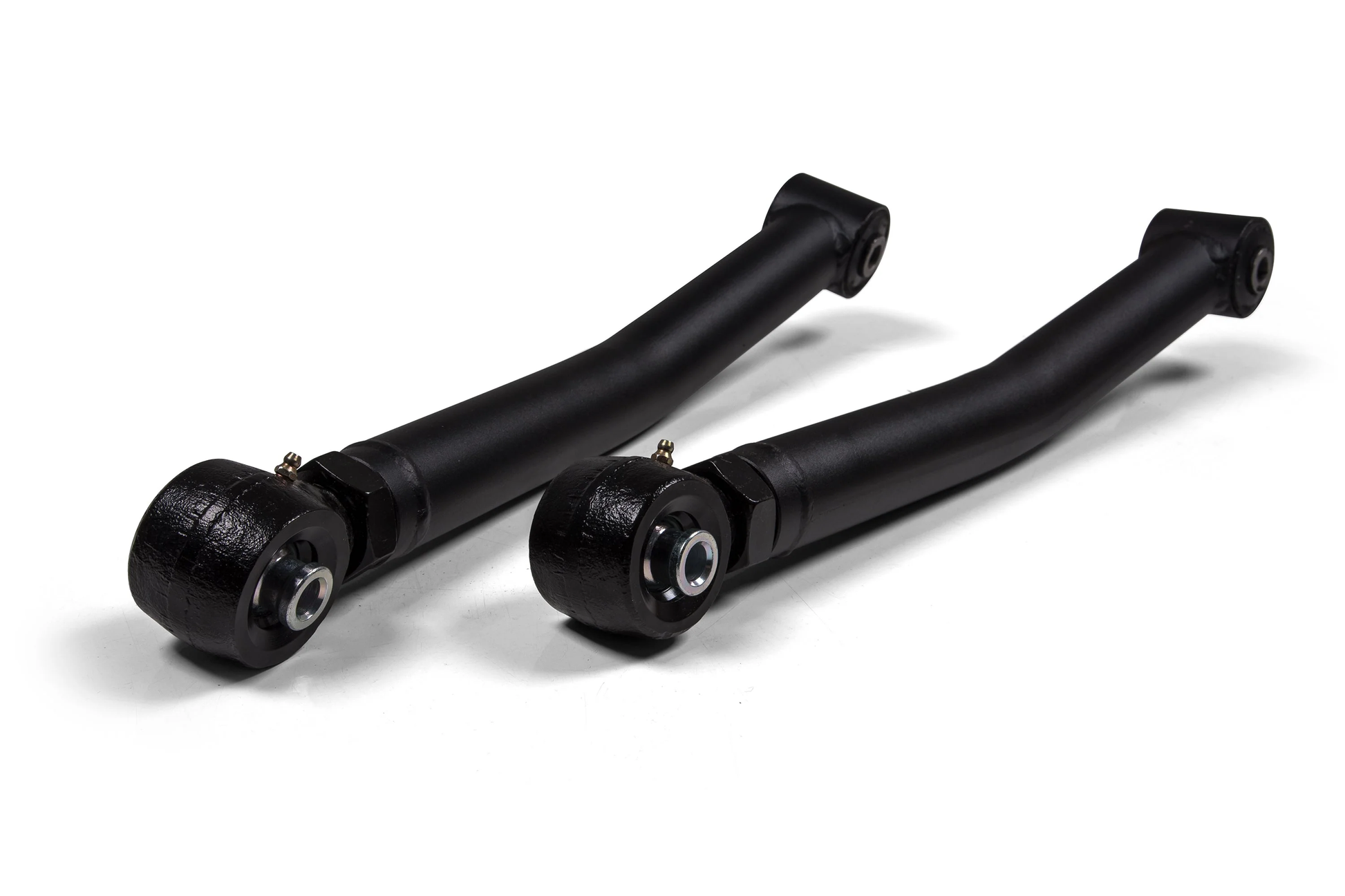 At the axle end they utilize an OE-style rubber bushing for long service-free operation and better isolation of noise, vibration, and harshness (NVH). At the frame mount they feature a large, forged flex end for strength, durability, and off-road articulation. The forged flex ends allow length adjustments to correctly position the rear axle and correct caster. Capable of 15-degrees of misalignment in either direction for more flex out on the trail.